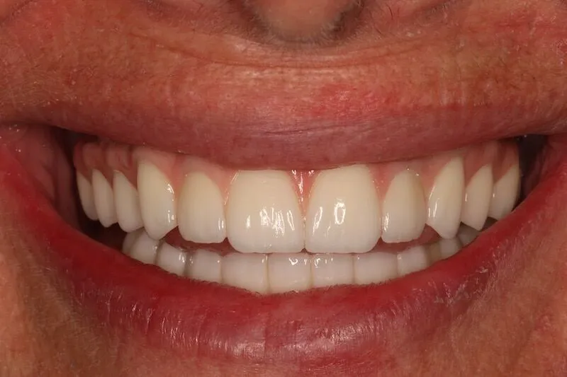 A few days later, the patient received temporary removable dentures to wear during the healing phase. She used these temporaries for approximately six months while the implants fully integrated into the jawbone.