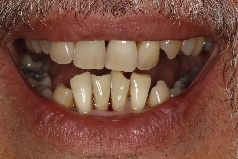 This patient presented to our office with extreme tooth sensitivity, mobility, and noticeable tooth shifting. His main goals were to eliminate the sensitivity and achieve a healthier, more attractive smile.