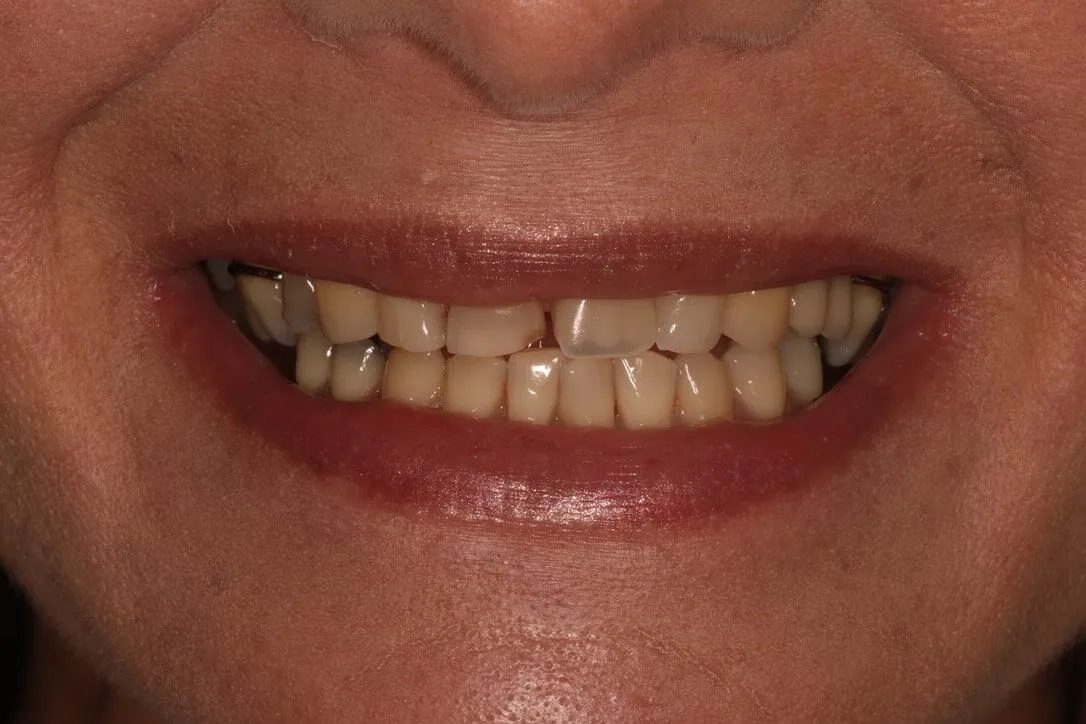 This patient came to us with a severely compromised smile. She had lost several teeth years ago and was wearing a partial removable denture that was uncomfortable and unpleasant. Her goal was to restore her smile and achieve a dazzling, confident look.