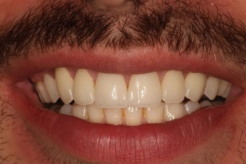 Our patient was deeply unsatisfied with his existing smile. His current lithium disilicate (porcelain) veneers appeared dull, opaque, and unnatural.
