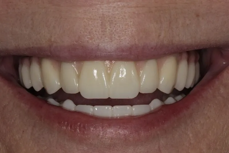 Our dental laboratory then fabricated the final zirconia All-on-4 prostheses. A few days later, the definitive restorations were delivered, the bite was adjusted, and the patient was released to test her new teeth in real-life situations.